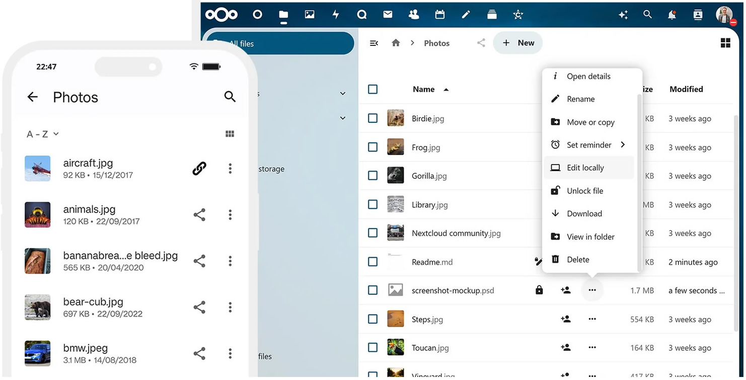 | Nextcloud Files es un software de almacenamiento en la nube y uso compartido de archivos que ofrece un acceso sencillo para compartir y colaborar desde cualquier lugar y en cualquier momento. Todo ello sin fugas de datos a terceros y con un control total sobre los datos. |